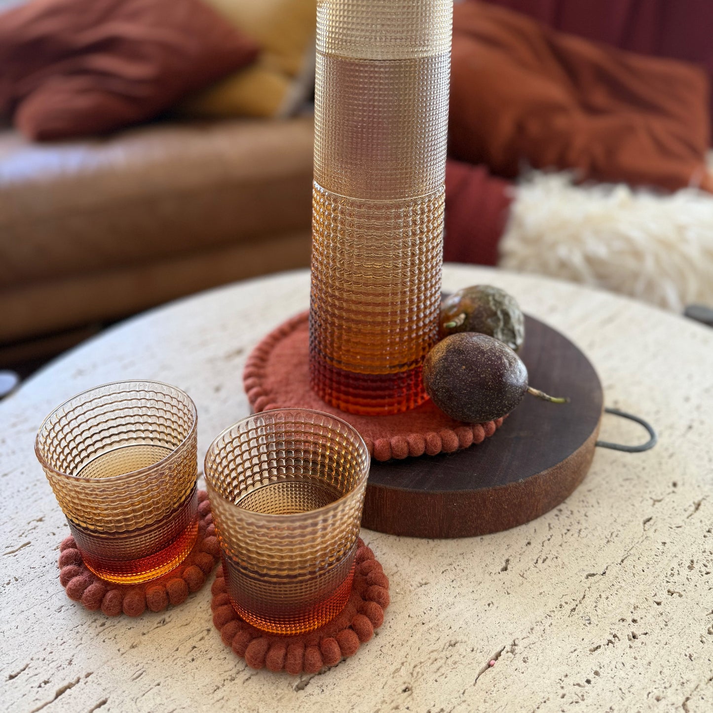 Beautifully handcrafted from natural felt, these coasters are designed to protect your surfaces while adding a soft, decorative touch to your home. Ideal for everyday use, they help guard tables from heat, moisture and scratches while looking lovely on display.